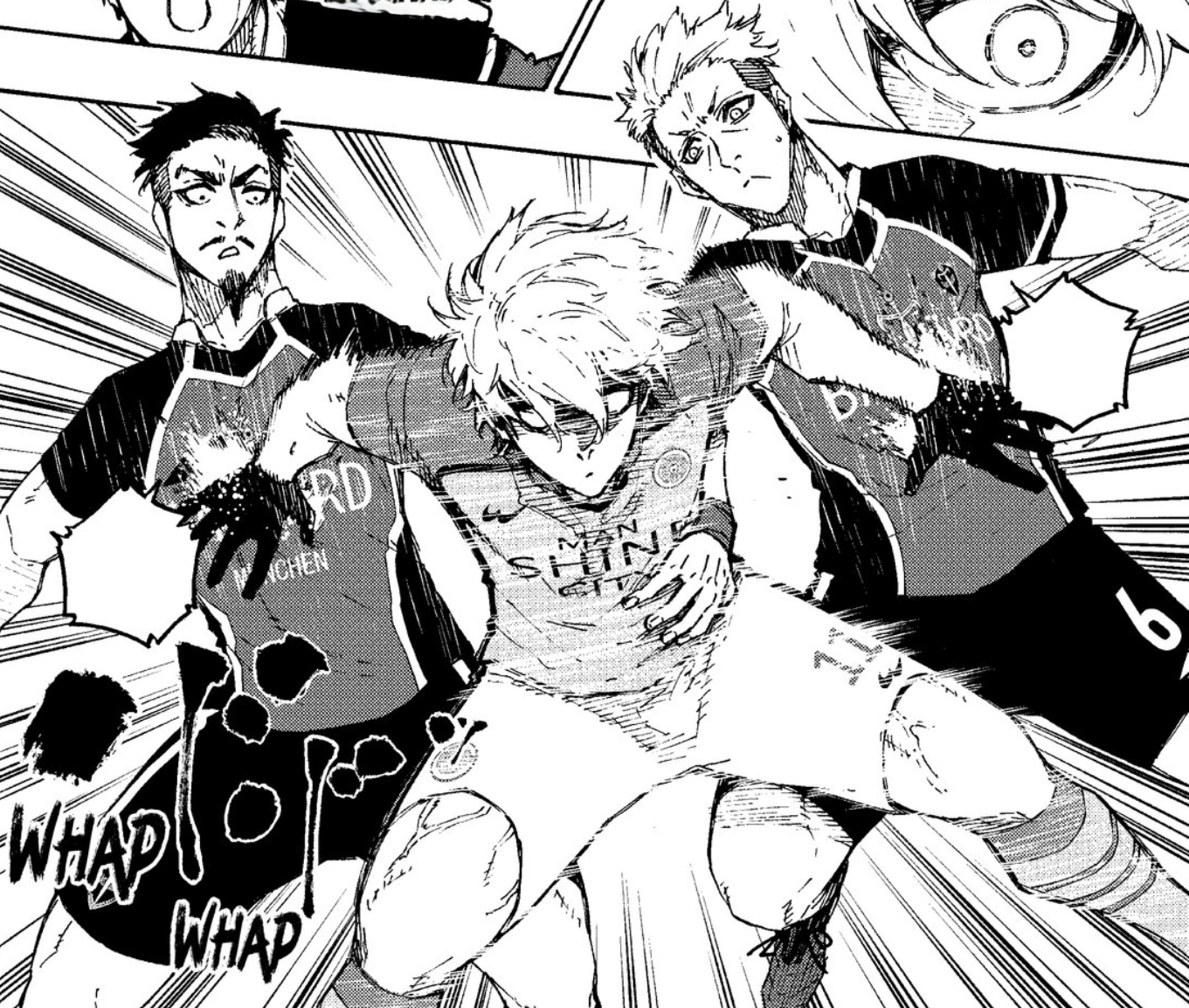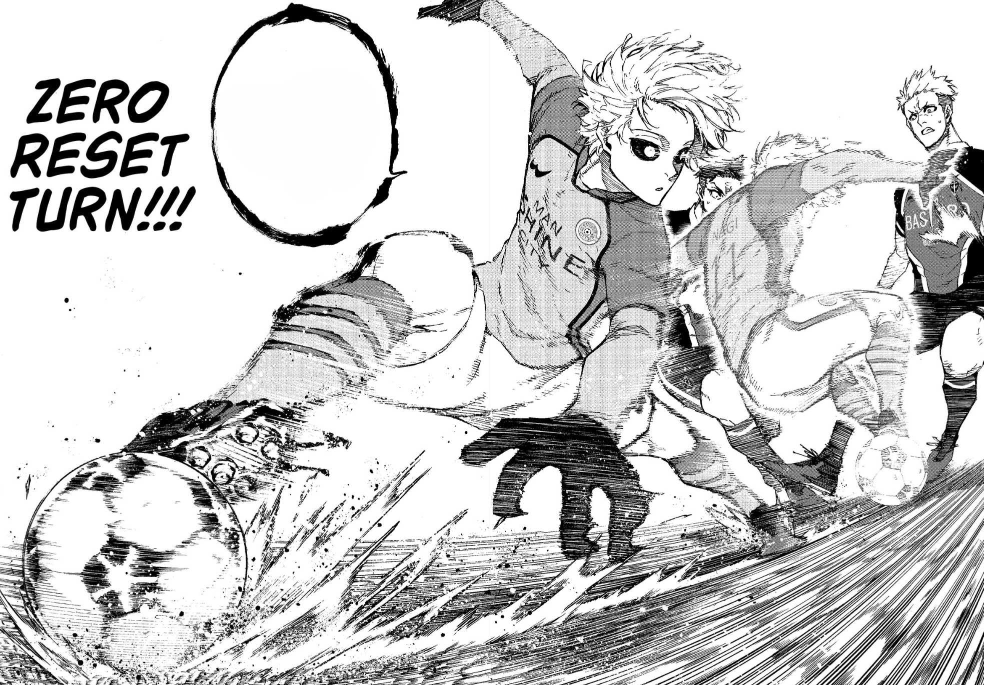 As Isagi and Kurona continue to charge down the right side of the field, Isagi sees Kunigami near the goalbox guarded by just one Manshine City defender. However, Isagi intends to make the goal himself rather than give it to Kunigami. Preparing to receive Kurona's pass so that he can shoot, Kaiser steps in to intercept the pass, calling the script Isagi wrote "so boring". Before Kaiser can move the ball further, Chigiri steps in using a sliding cut, calling Kaiser script "so slow that it'll put people to sleep."
