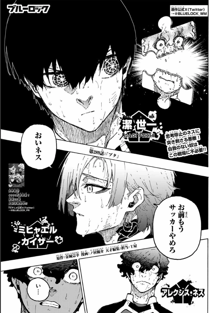 "Pig" (ブタ Buta?) is the 289th chapter overall of the Blue Lock manga series, written by Muneyuki Kaneshiro and illustrated by Yusuke Nomura.