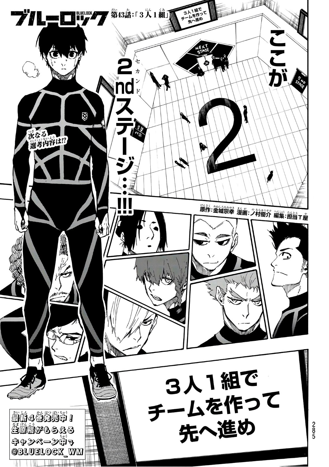 Isagi looks around the room filled with unfamiliar faces. He notices the instruction on the screen ("move forward in teams of three") and wonders what they will do in the next stage. While looking around the room, Isagi sees Nagi and Reo's faces. Isagi deduced that Nagi and Reo may have stayed in the waiting room since they were waiting for Zantetsu. Soon after, a voice calls out Isagi's name. Apparently, Bachira had just finished the first stage of the second selection. Like Isagi, he also notices the message on the screen. Bachira then asks Isagi who will take the last spot in their three-man team. Isagi gets confused, asking Bachira what he meant. Bachira explained, saying that there's him and Isagi. Now, they only have one more slot. In his mind, Isagi is shocked that Bachira automatically grouped themselves together. However, Isagi does not mind. After that, Isagi suggests to Bachira that Kunigami or Chigiri can be the third person in their team. Bachira agrees; however, he also asked who among the two they will pick. Isagi replies, saying that they will choose whoever finishes the first stage first. The two players come into agreement.
