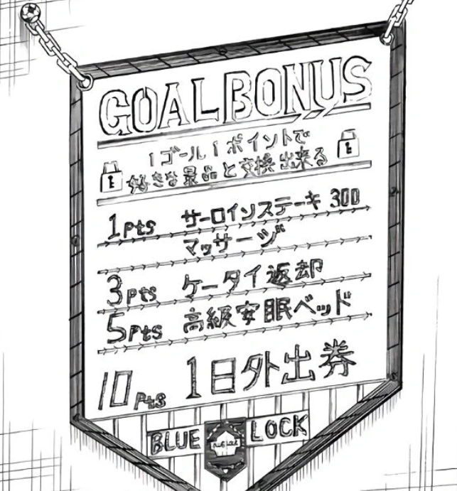 Kunigami then offers Isagi a plate of steak. Kunigami shows to Isagi the goal-exchange system. He then explains that for every goal a player scores, you can exchange it for various stuff. 1 point for 300g sirloin steak. 3 points for a cellphone return. 5 points for a high-quality bed. Lastly, 10 points for a day outside. Kunigami shares the steak with Isagi, believing that he deserves half the credit for it.